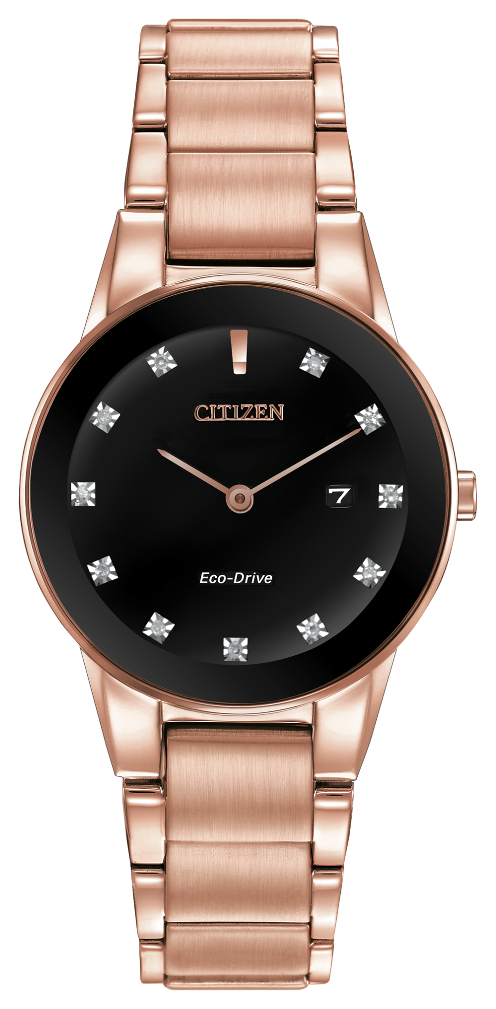 Axiom's refined yet sleek design offers a day-to-night fashion option for the avid trendsetter. This timepiece, with pink gold-tone stainless steel case and bracelet with black dial, features the intriguing detail of edge-to-edge glass, an 11 diamond dial and date.Featuring our Eco-Drive technology – powered by light, any light. Never needs a battery. Caliber number J015.