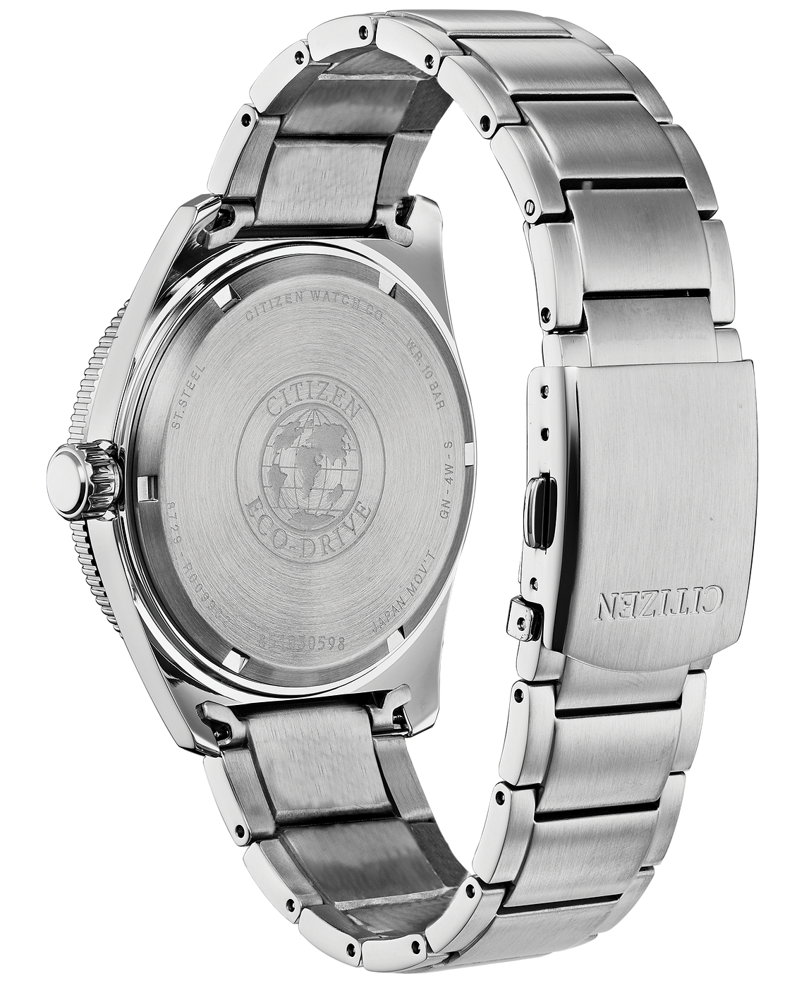 Nothing says classic better than a vintage throwback, and the redesigned Citizen Vintage Brycen Sport timepiece is just that, with distinguished features sure to stand out on your wrist. This stylish watch in a stainless steel case with pine green dial and bezel, stainless steel bracelet and date. Featuring our Eco-Drive technology – powered by light, any light. Never needs a battery. Caliber number J810.
