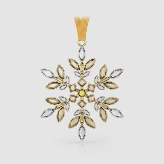 Inspired by the vibrant Gema family, this collection of radiant snowflake ornaments is presented in Swarovski brand colours with a nod to the holiday season. This yellow piece is formed from 86 individual crystals in a variety of cuts and shades, applied on both sides using jewellery stone setting techniques. The design is suspended from a yellow grosgrain ribbon and is completed with a glossy gold-tone finish. Collect all four of the Gema snowflake ornaments to create a joyful multicoloured display in your home. Decoration object. Not a toy. Not suitable for children under 15.