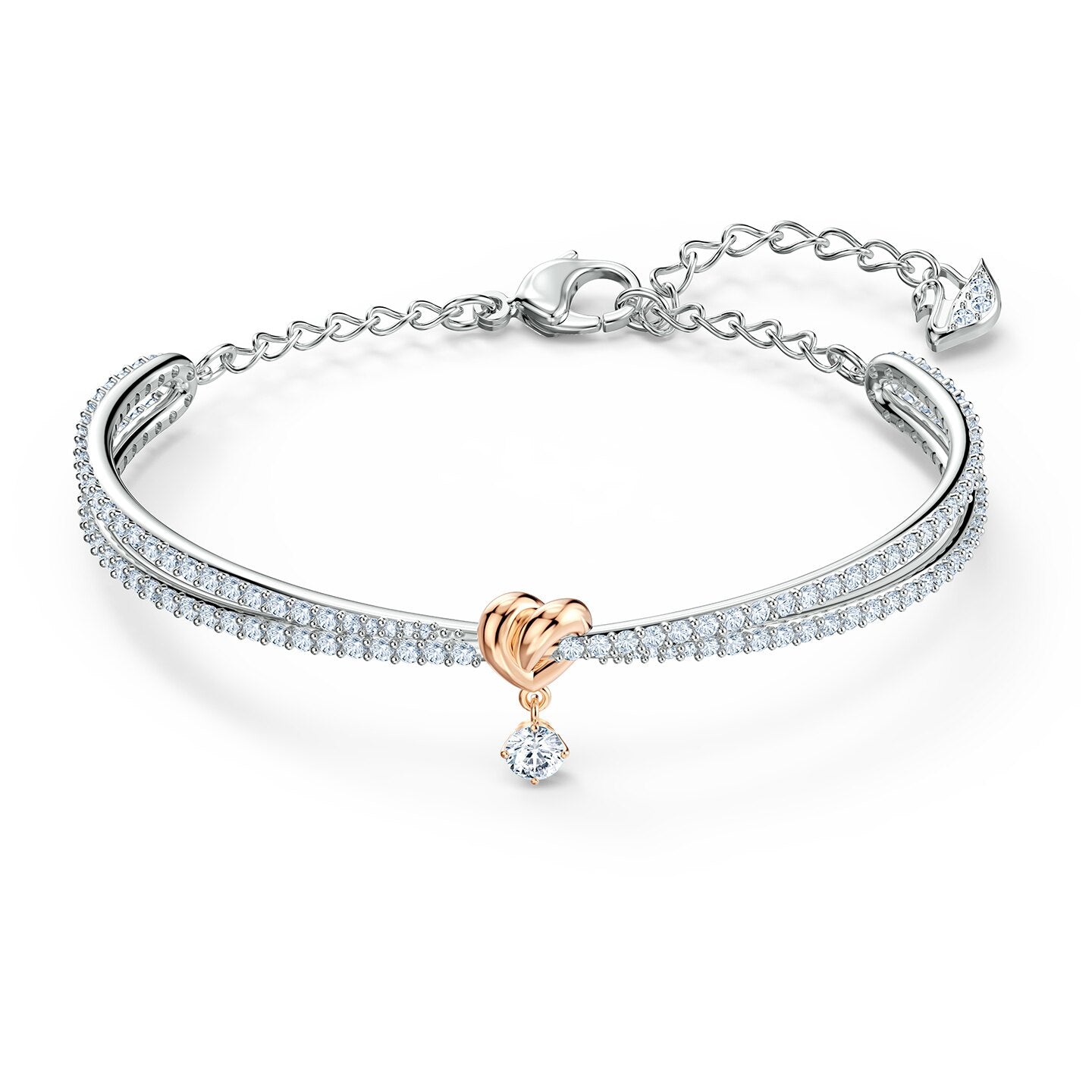 This Swarovski bangle features an array of sparkling stones and impresses with a glamorous look. Delightful details like the curved rose-gold tone plated heart add to the elegant design. The expertly crafted materials work together seamlessly to create a timeless masterpiece. Gift givers will delight their loved ones with this lovely bangle.