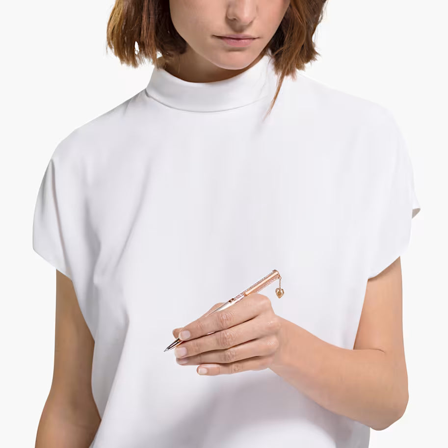 This refillable ballpoint pen by Swarovski features a powerful and romantic design. The color scheme of rose-colored lacquered metal and rose-gold tone plating lends it an air of elegance. Numerous Swarovski crystals fill the pen, making it sparkle brilliantly. A small, heart-shaped charm showing the word 'LOVE' is surrounded by beautiful crystals. The perfect romantic gift for a special someone.