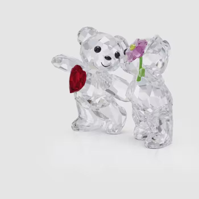 With a total of 867 facets, this charming pair of Kris Bears sparkles beautifully in clear crystal. One holds a red crystal heart, while the other holds a pink crystal flower with a green lacquered metal stem and leaf. A wonderful gift idea for a wedding, anniversary or any other special occasion. Decoration object. Not a toy. Not suitable for children under 15.