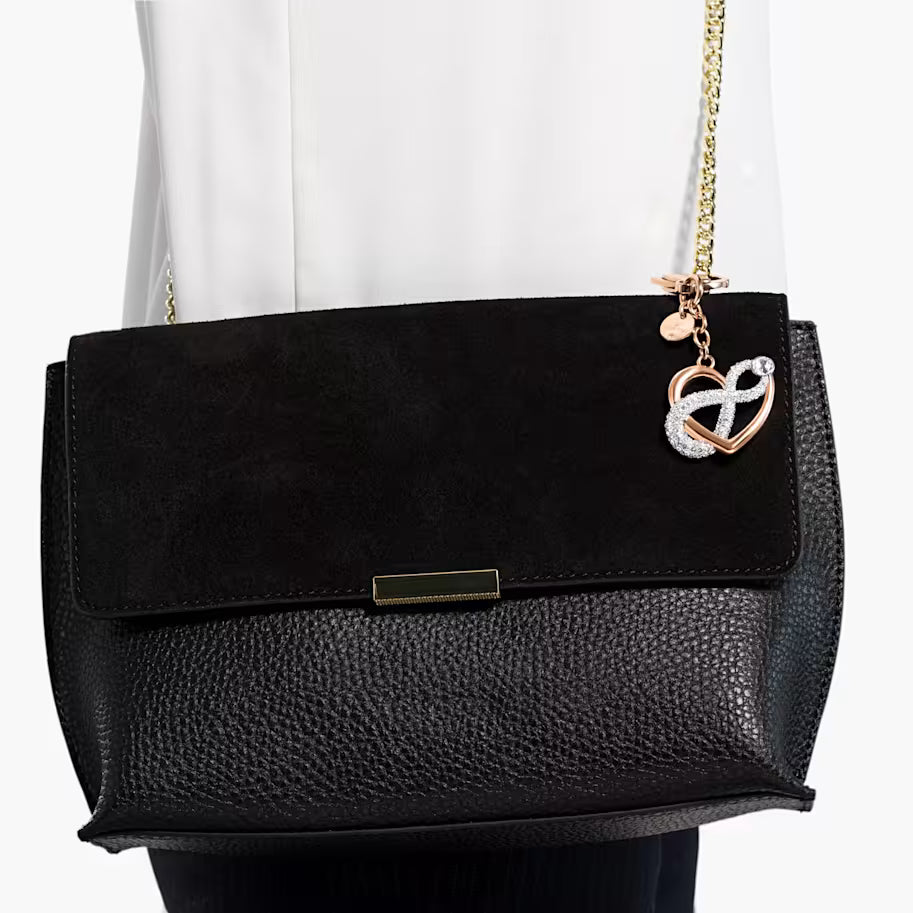 The art of eternal love. This romantic bag charm by Swarovski skilfully combines a rose-gold tone plated heart and a rhodium-plated infinity symbol. The expressive design is completed by a sparkling Swarovski crystal set into the spot where both elements meet. Fitted with a lobster clasp, this accessory can be used as a bag charm or as a key ring. Beautiful on its own, it could also be attached to a romantic gift for a special someone.
