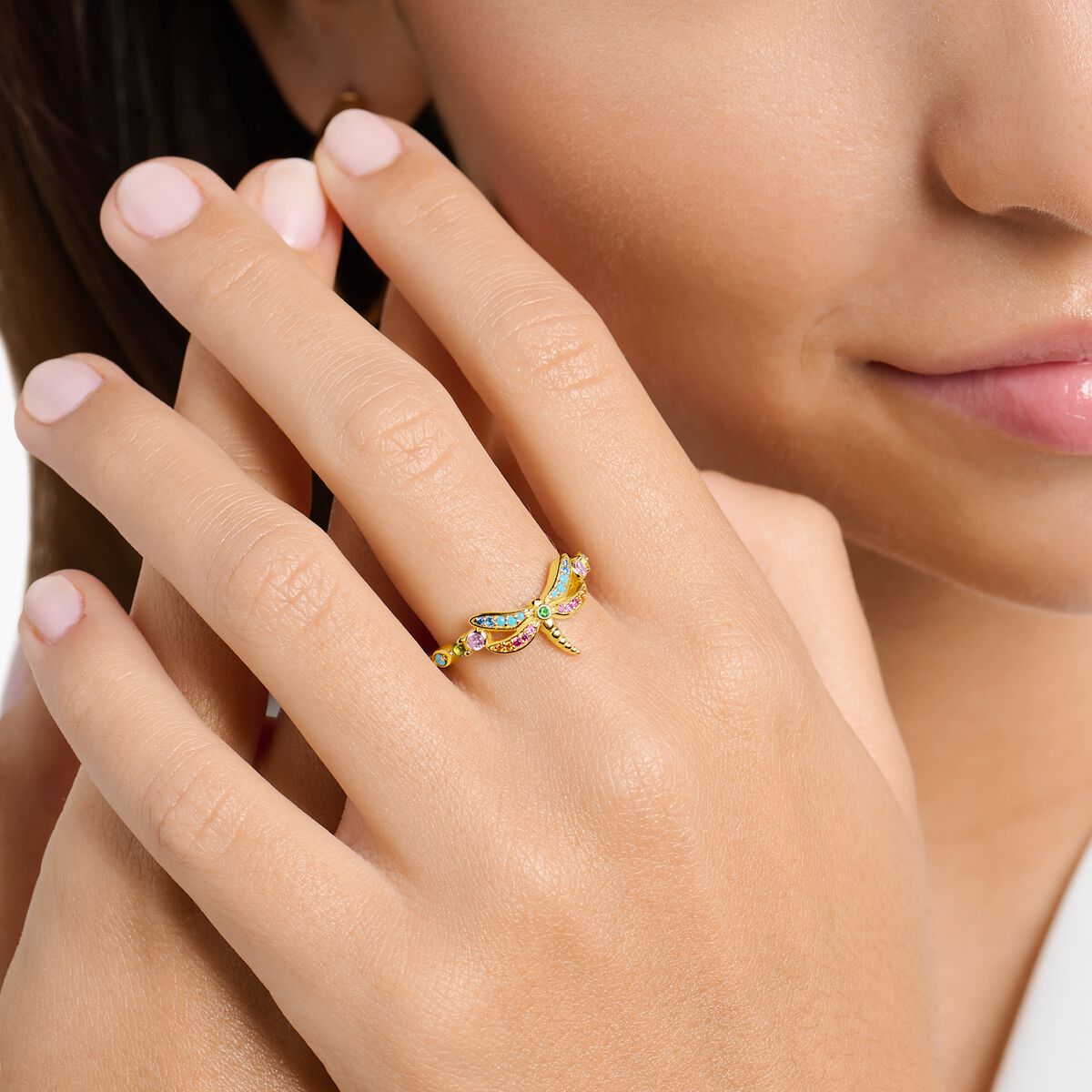 Journey to paradise: With hand-set gemstones in the colours of the rainbow, this ring evokes positive feelings. It is finely crafted from 925 Sterling silver and finished with a precious shiny 18k yellow gold plating. A dragonfly sparkles in its centre – the symbol of lightness.