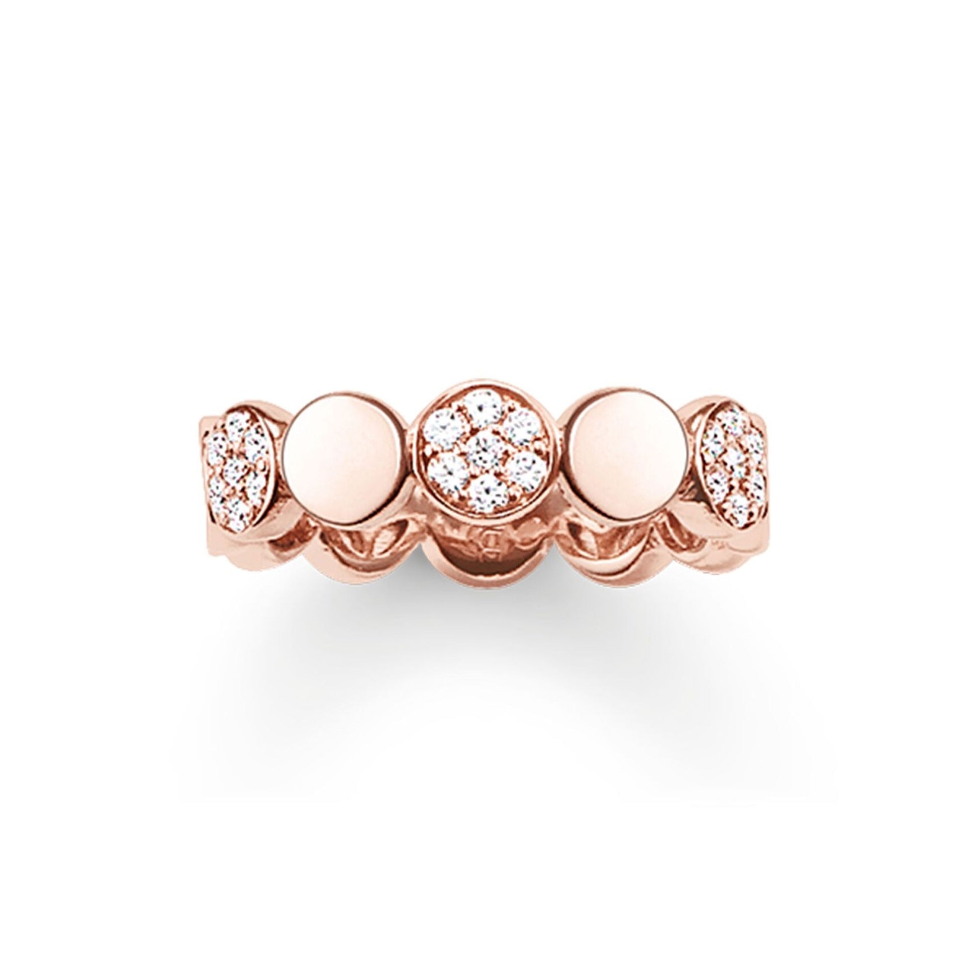 From the Thomas Sabo Glam & Soul jewellery collection, this dress ring is pave set with white cubic zirconia mounted in sterling silver 18k rose gold plated, in alternating plain and stone-set bubble design.